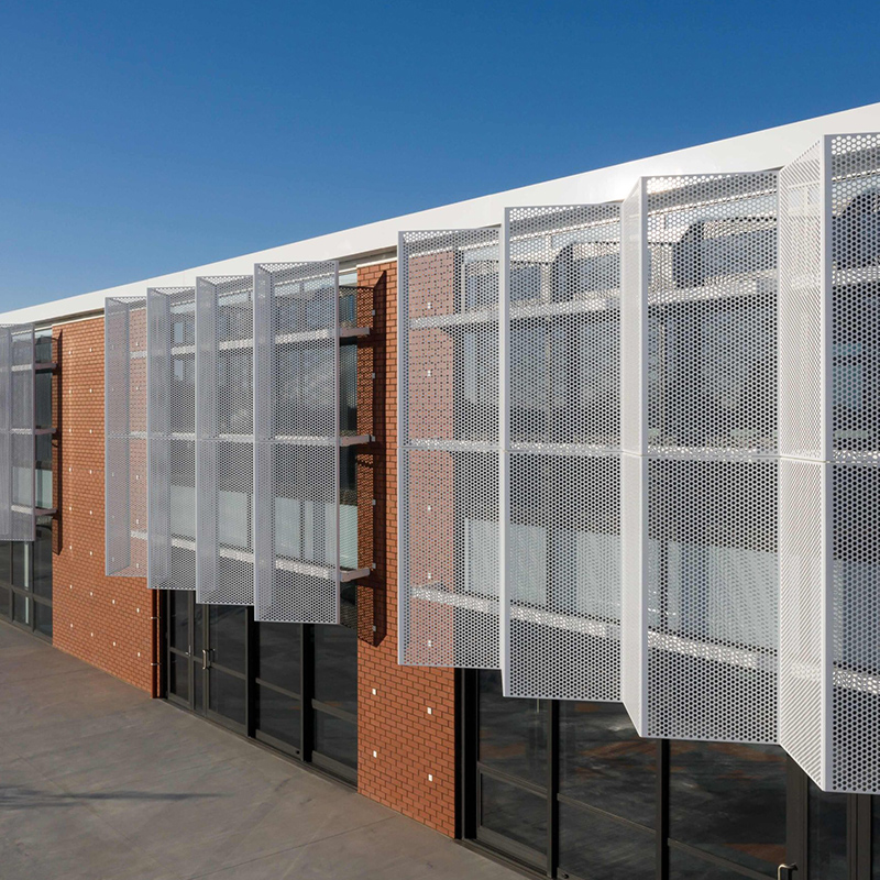穿孔金屬板廣泛用于外部陽(yáng)光控制系統(tǒng)。 為此,面板使人們享受舒適的工作環(huán)境而不會(huì)刺眼的陽(yáng)光,并保持空氣流入建筑物并調(diào)節(jié)溫度。 此外,這種采用也為建筑外墻增添了活力。 穿孔金屬防曬霜的最佳選擇材料是鋁或鋁合金。 成品具有很高的強(qiáng)度重量比,即使在長(zhǎng)期的陽(yáng)光照射下也能抵抗老化。